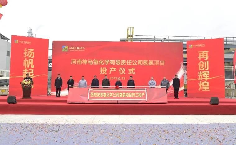 上午10时18分,中国平煤神马能源集团股份有限公司董事长李毛同志宣布河南神马氢化学有限公司氢氨项目投产。随后李毛董事长邀请平顶山市副市长许红兵、政协副主席张电子、河南神马氢化学有限责任公司党委书记执行董事王大勇等领导共同按动投产气动按钮,标志着河南神马氢化学有限责任公司氢氨项目正式投产。